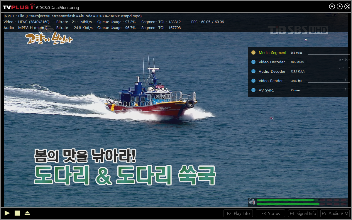 KBS, MBC, SBS 등에서 송출하는 ATSC 3.0 UHD 방송 신호를 수신하여 실시간으로 데이터를 분석하고 비디오 및 오디오를 재생하여 방송 신호가 정상적으로 송출되고 있는 지 모니터링하기 위한 소프트웨어로서 현재 KBS 본사 및 지역 방송국에서 운영되고 있습니다.