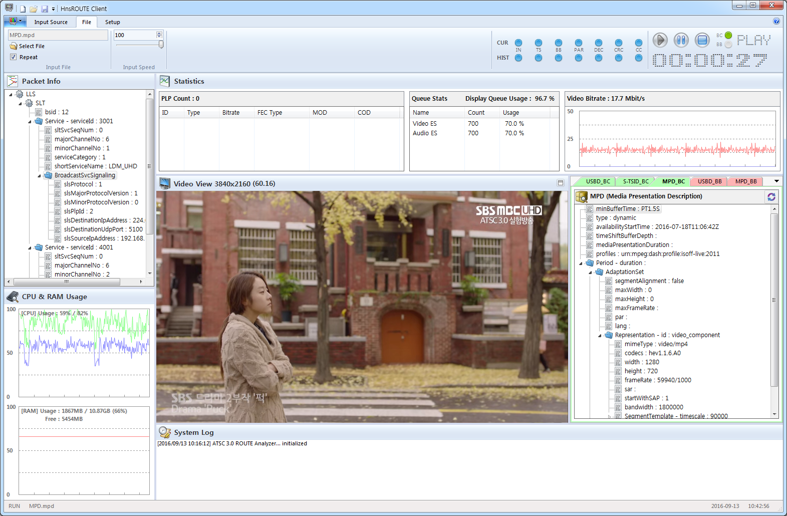ATSC 3.0의 스트림을 수신하고 ROUTE 프로토콜 수준의 패킷을 분석하며 4K 60fps의 HEVC 비디오를 실시간으로 재생하는 소프트웨어입니다. 한국전자통신연구원과 함께 개발하였으며 UHD 본방송이 시작되기 전 본방송을 위한 수년간의 기술 개발 단계에서 진행된 여러 프로젝트 중 하나의 결과물입니다.